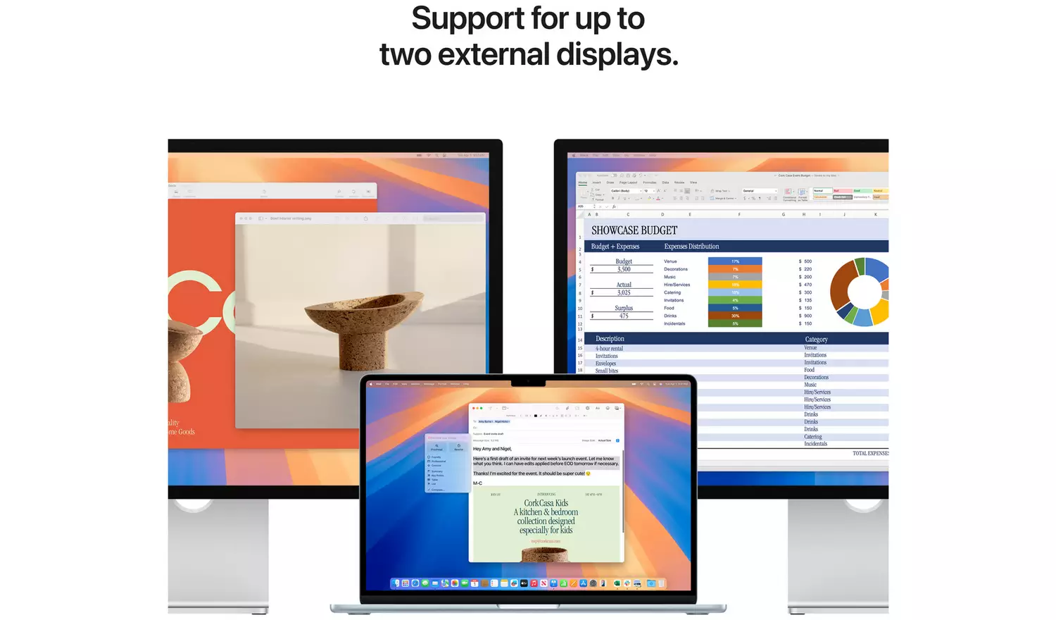 With two Thunderbolt 4 ports, MagSafe charging, a headphone jack, Wi-Fi 6E, and Bluetooth 5.3, MacBook Air lets you connect everything you need. It even supports up to two external displays.