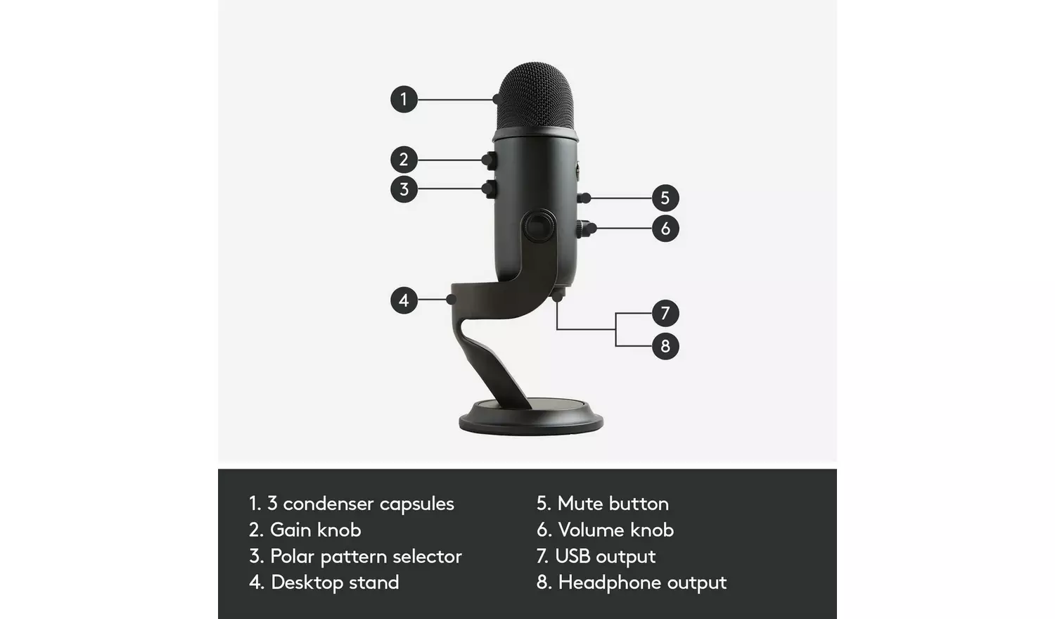 Delivering crystal-clear, broadcast-quality sound, the Yeti is your go-to mic for podcasting, YouTube videos, game streaming, Skype calls, and music production.